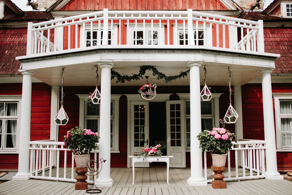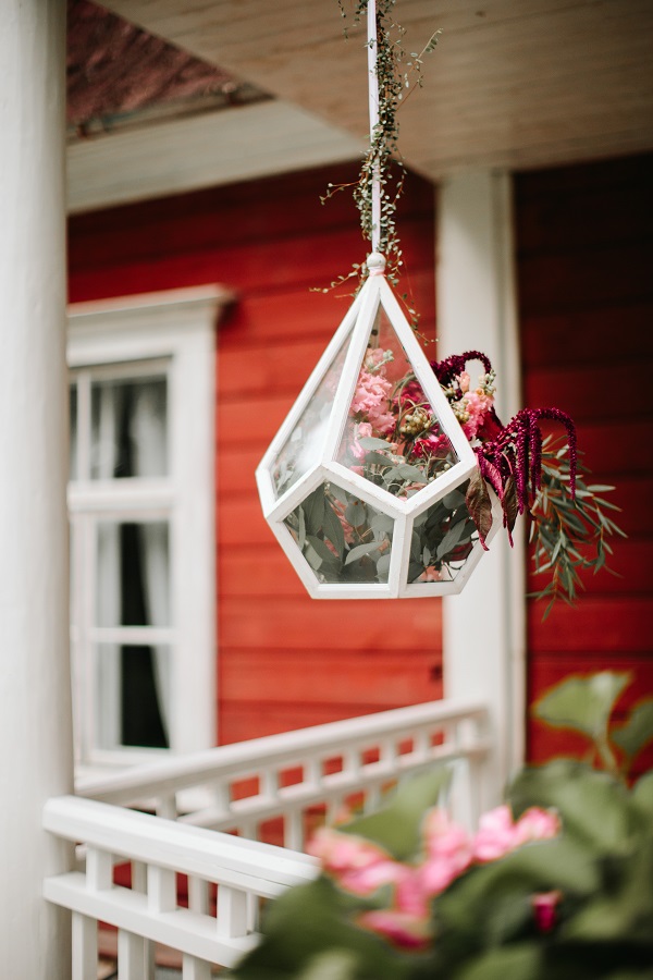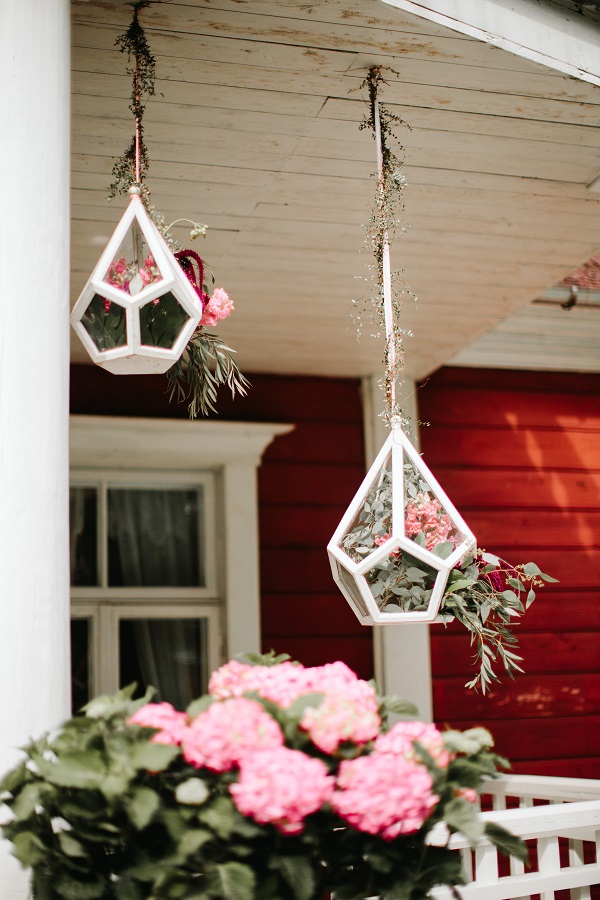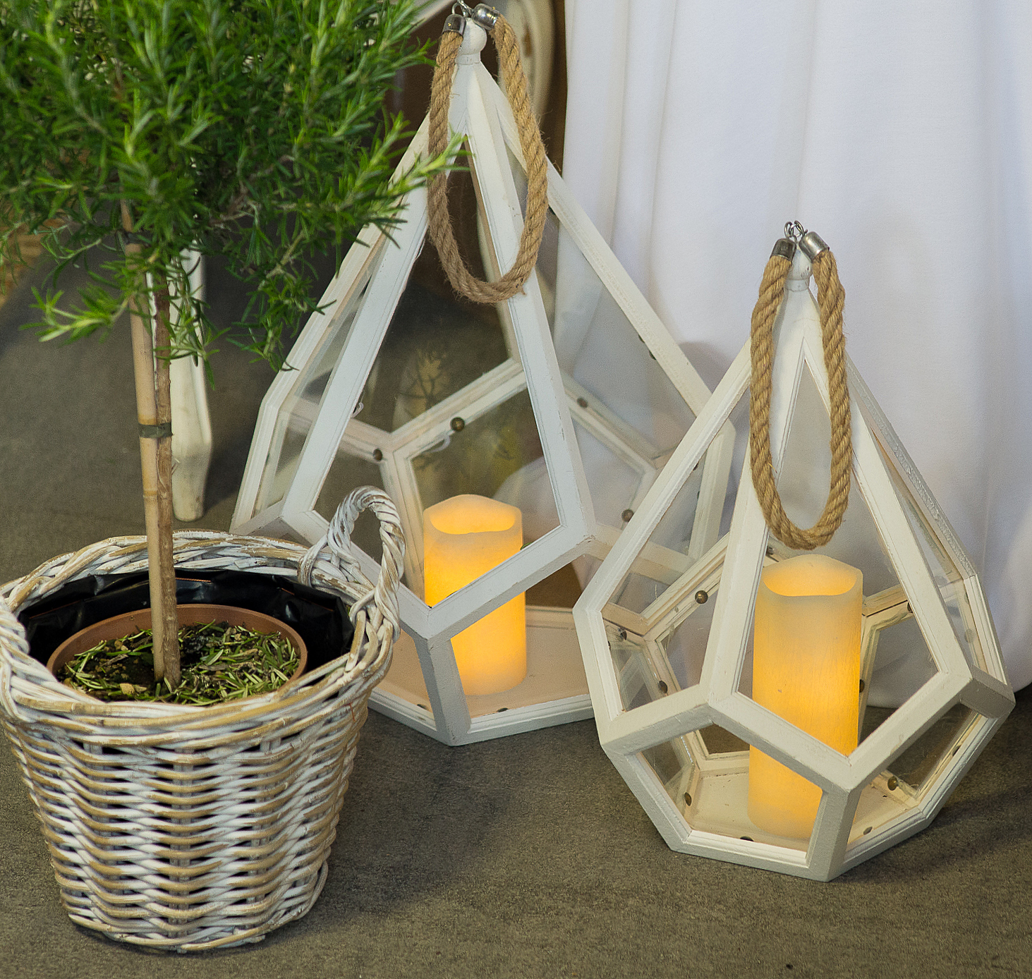 Balti konusveidīgi lukturi ar brūniem virves rokturiem. Ērti iekarināmi.