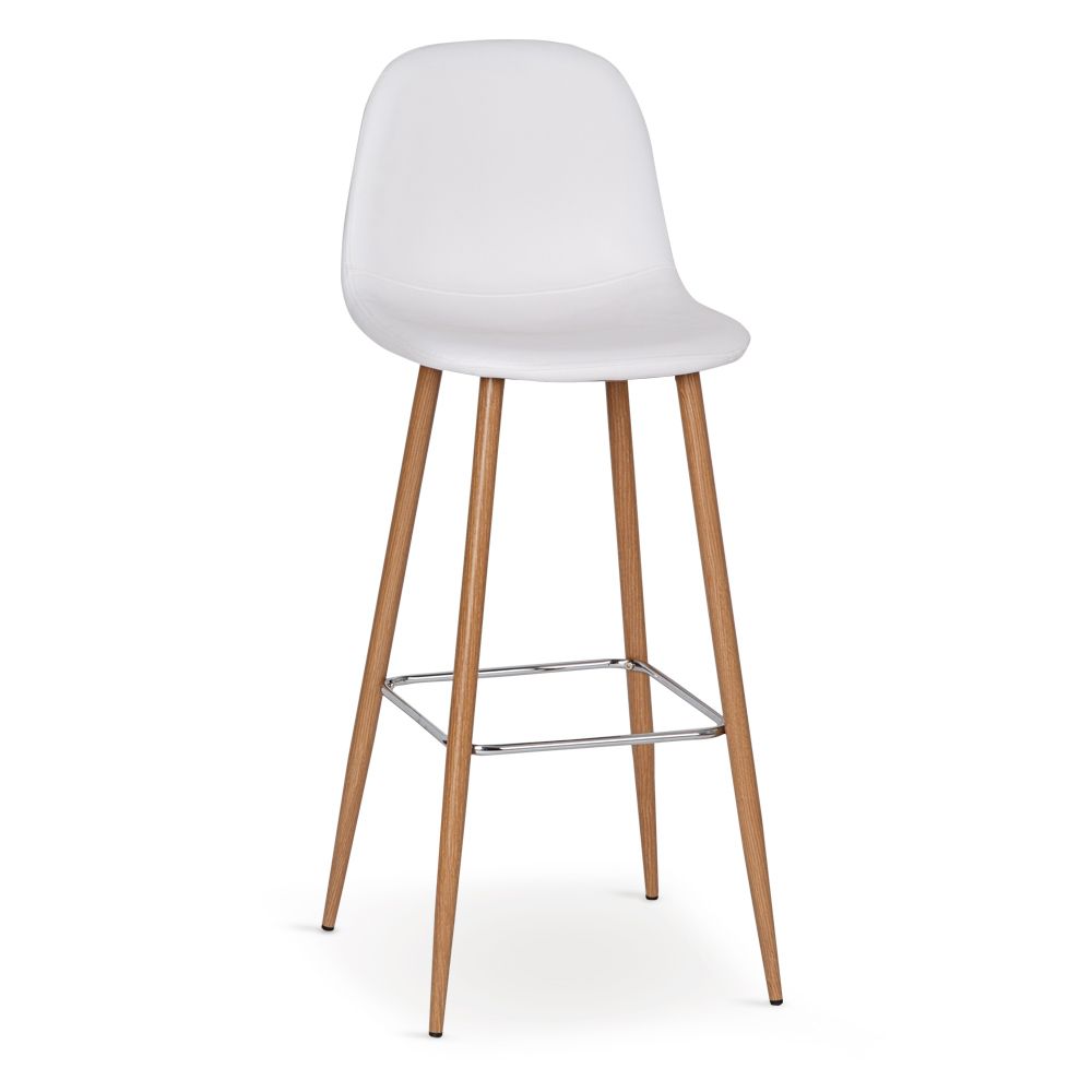 Bāra krēsls baltā krāsā. Sēdvieta izgatavota no mākslīgās ādas. Krēslam ir koka kājas un metāla elementi dizainā.