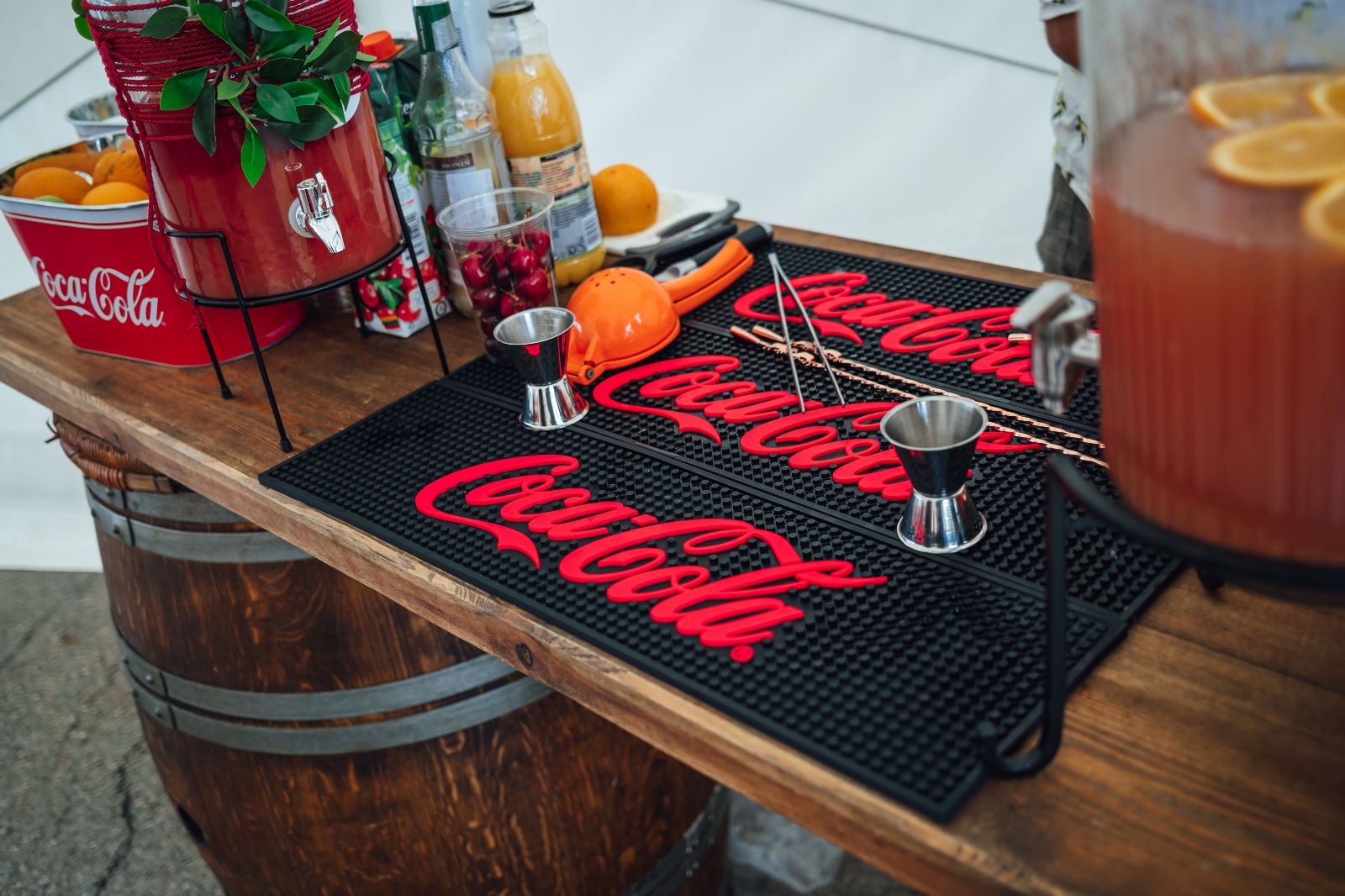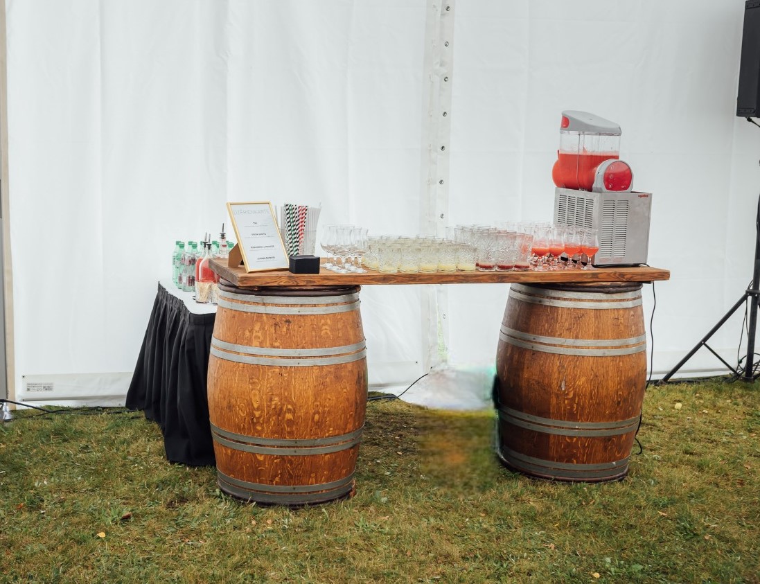 Ozolkoka galda virsma ar 2 koka/vīna mucām, kas lieliski kalpos kā bārs. Galda virsmas apakšā ir speciāli pielāgotas ķepiņas, kas piekļaujas mucas malai un neslīd.