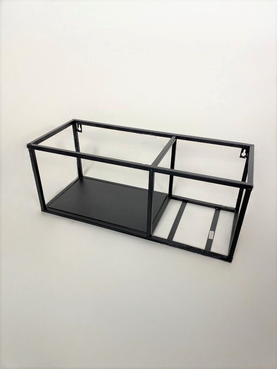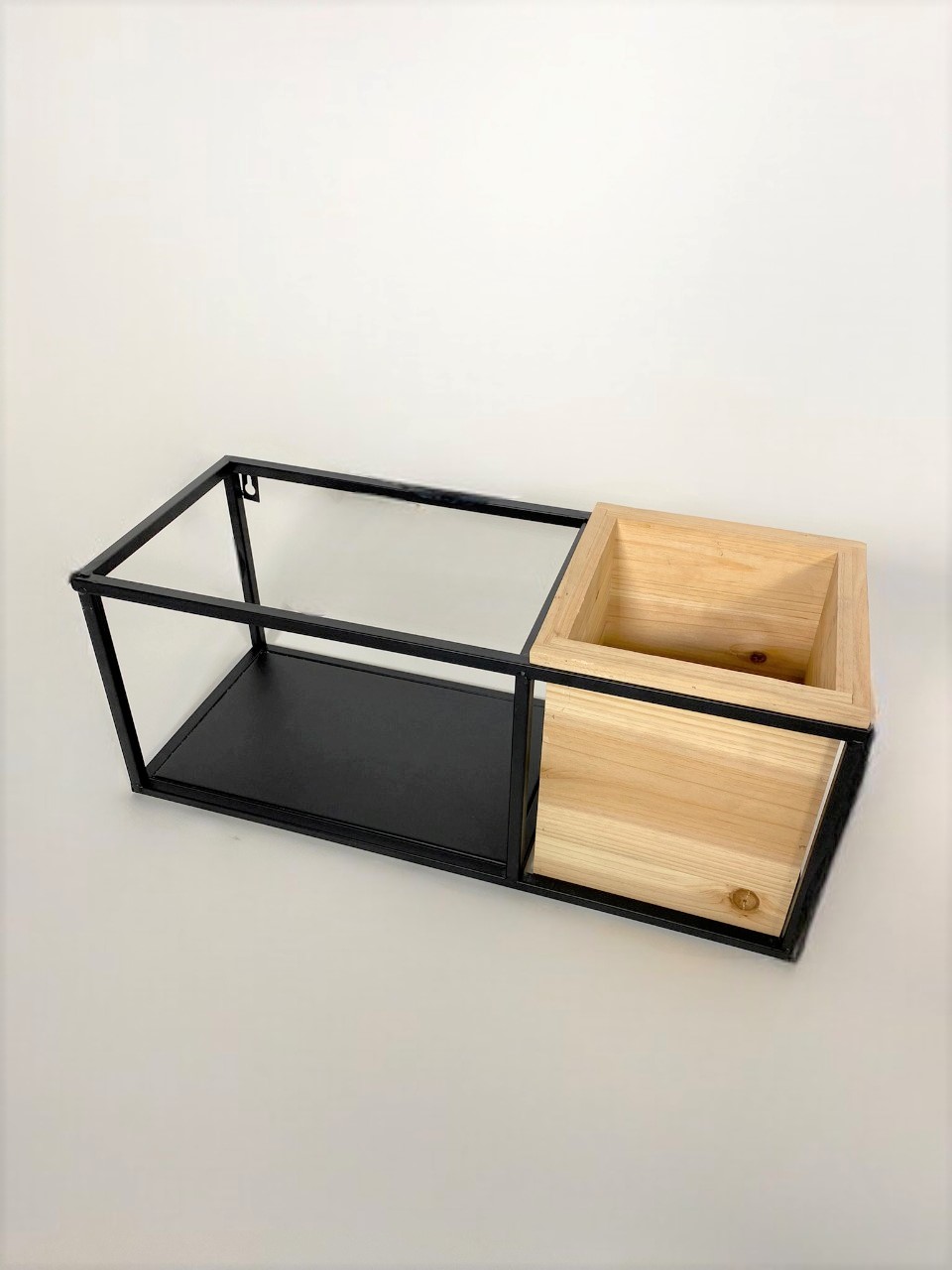 Metāla piekarināms plaukts ar izņemamu koka kasti. Var izmantot arī kā stendu. Stabili stāv gan horizontāli, gan vertikāli.