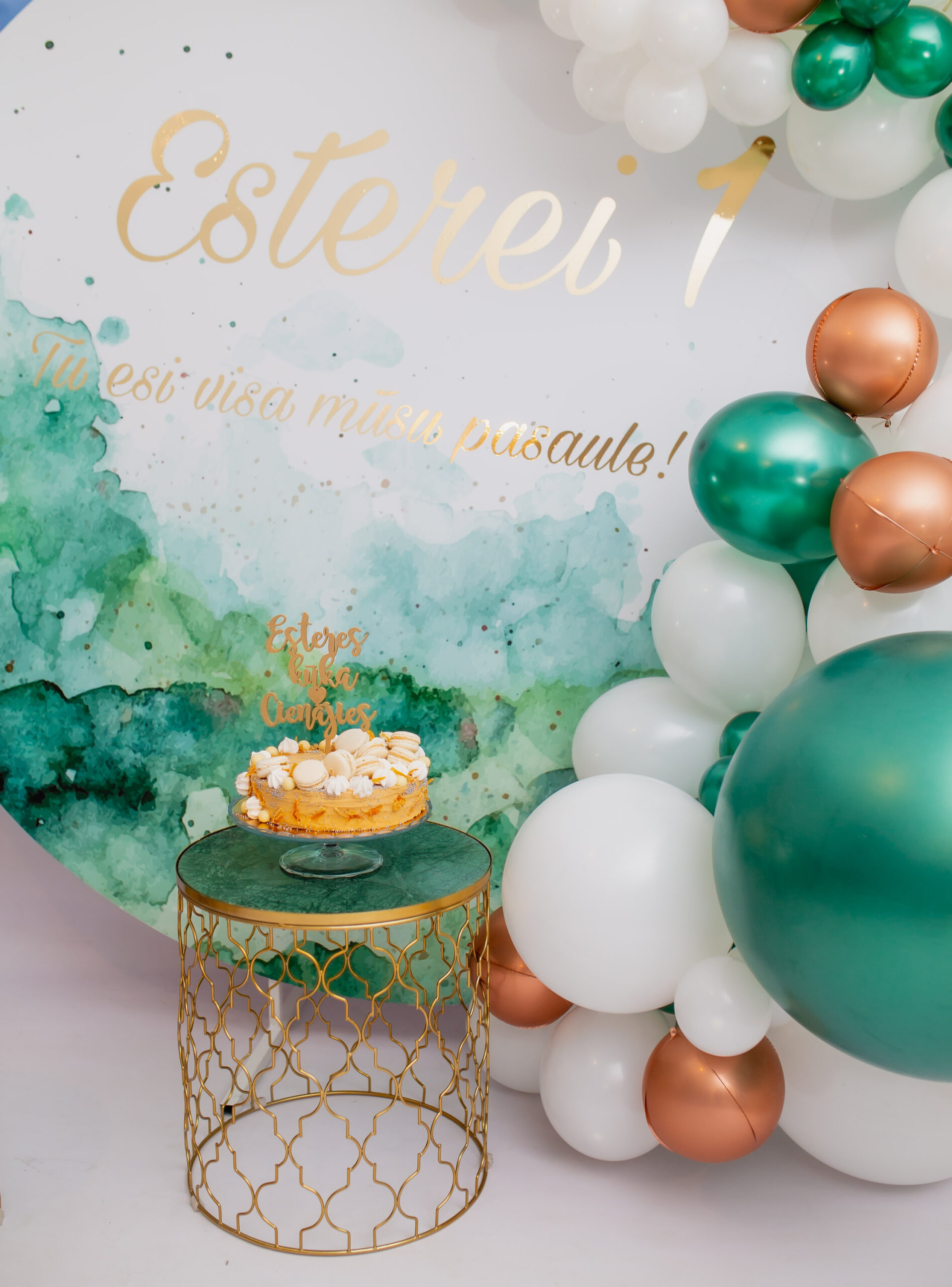 Komplektā ietilpst – plāksne ar personalizētu uzrakstu, zelta kafijas galdiņi ar zaļu marmora virsmu (2 gab), balonu noformējums.