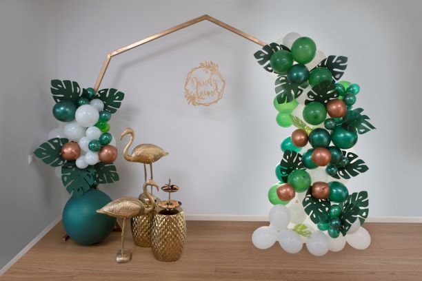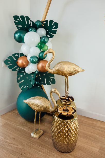 Komplektā ietilpst – zelta arka, balonu noformējums apkārt arkai ar dekoratīvām lapām, zelta ananasu podesti (2 gab.), zelta flamingo figūras, koka uzraksts.