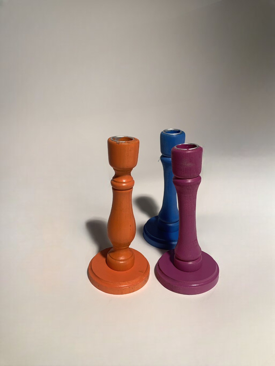 Krāsaini koka svečturi garajām svecēm. Pieejami oranžā, zilā un violetā krāsā.