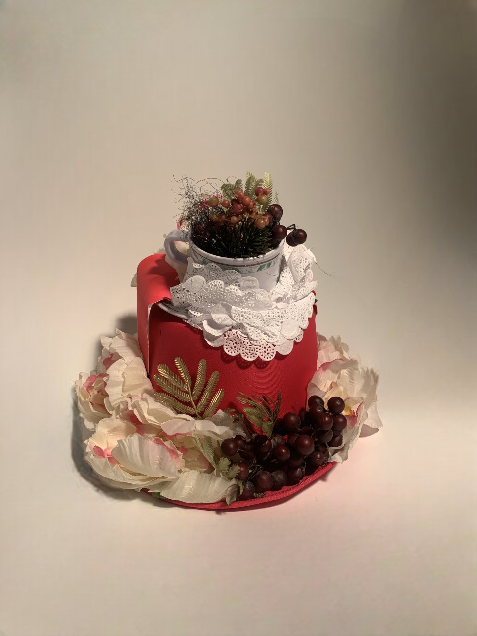 Pēc pasūtījuma darināta sarkana cepure ar ogam un ziedu lapām. Var izmantot gan kā dekorāciju vai nēsāt kā cepuri.