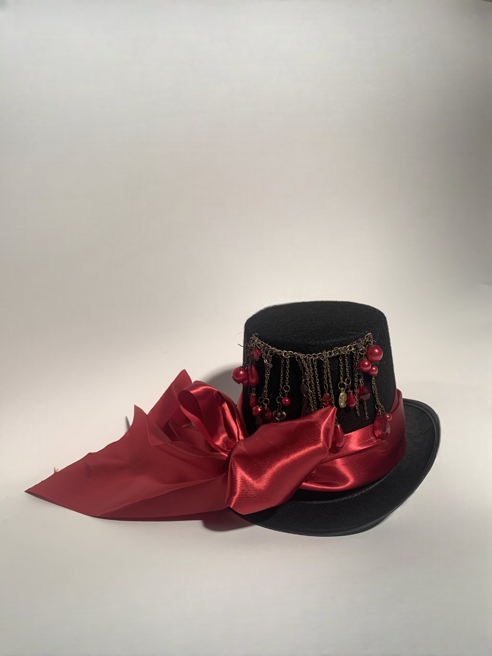Pēc pasūtījuma darināta sarkana cepure ar lielu sarkanu satīna banti un nokareniem dekoriem. Var izmantot gan kā dekorāciju vai nēsāt kā cepuri.