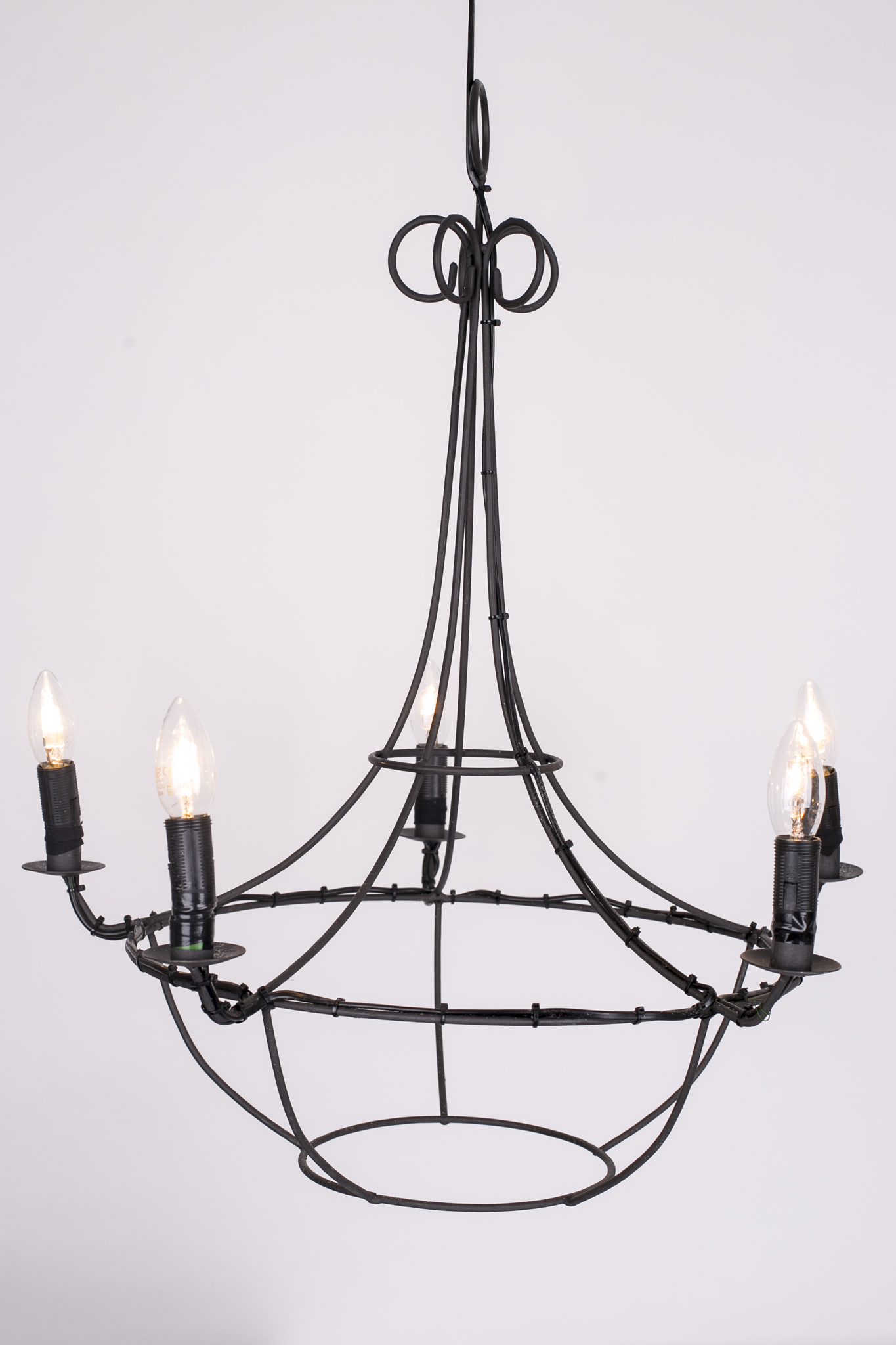 Melna metāliska lustra – ļoti izturīgs metāla karkass. Lustru var dekorēt ar ziediem utt.