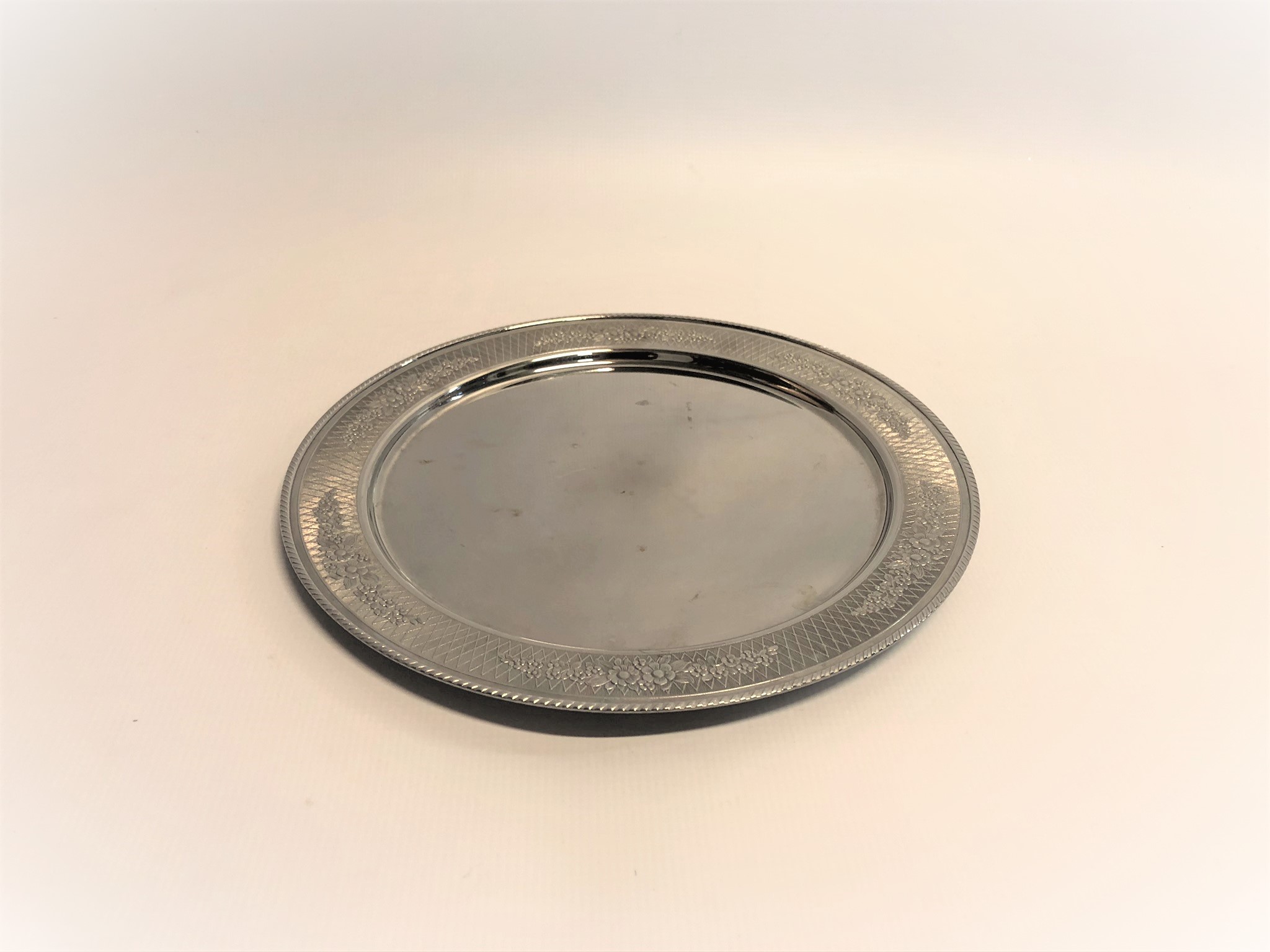Sudraba krāsas metāla paplāte ar dekoratīvu rakstu apkārt.