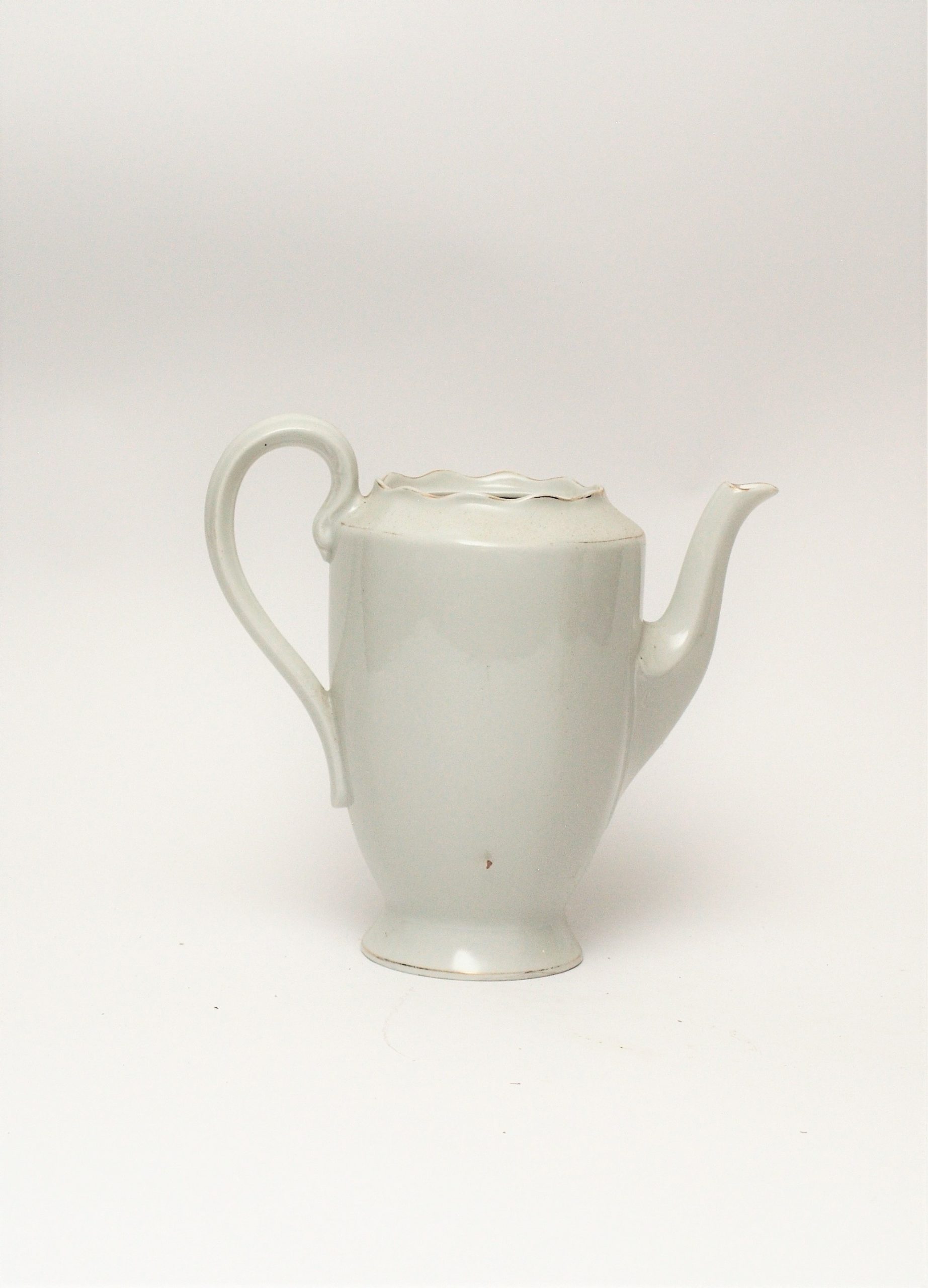 Balta porcelāna tējkanna ar zelta akcentiem. Defekts tējkannas vāciņā.