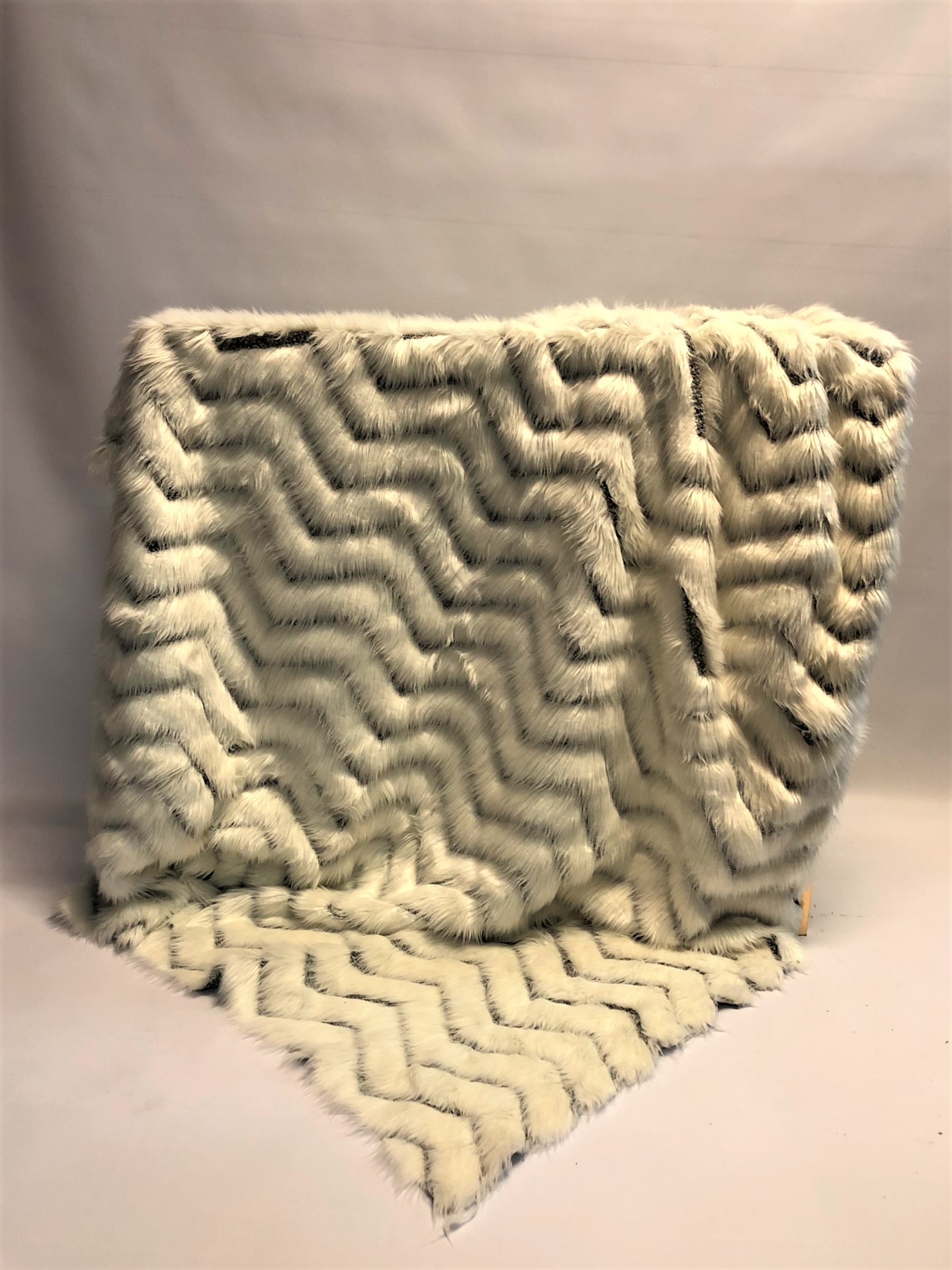Balts, mīksts, pūkains audums ar “zig zag” līnijām brūnā krāsā. Var izmantot kā paklāju un kā dekoratīvu audumu.