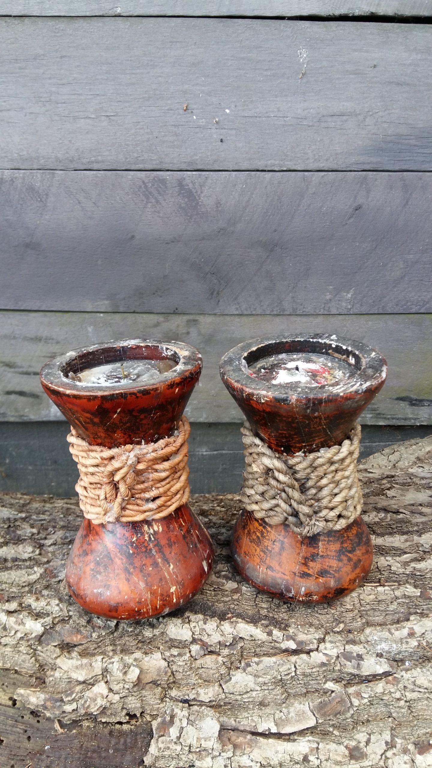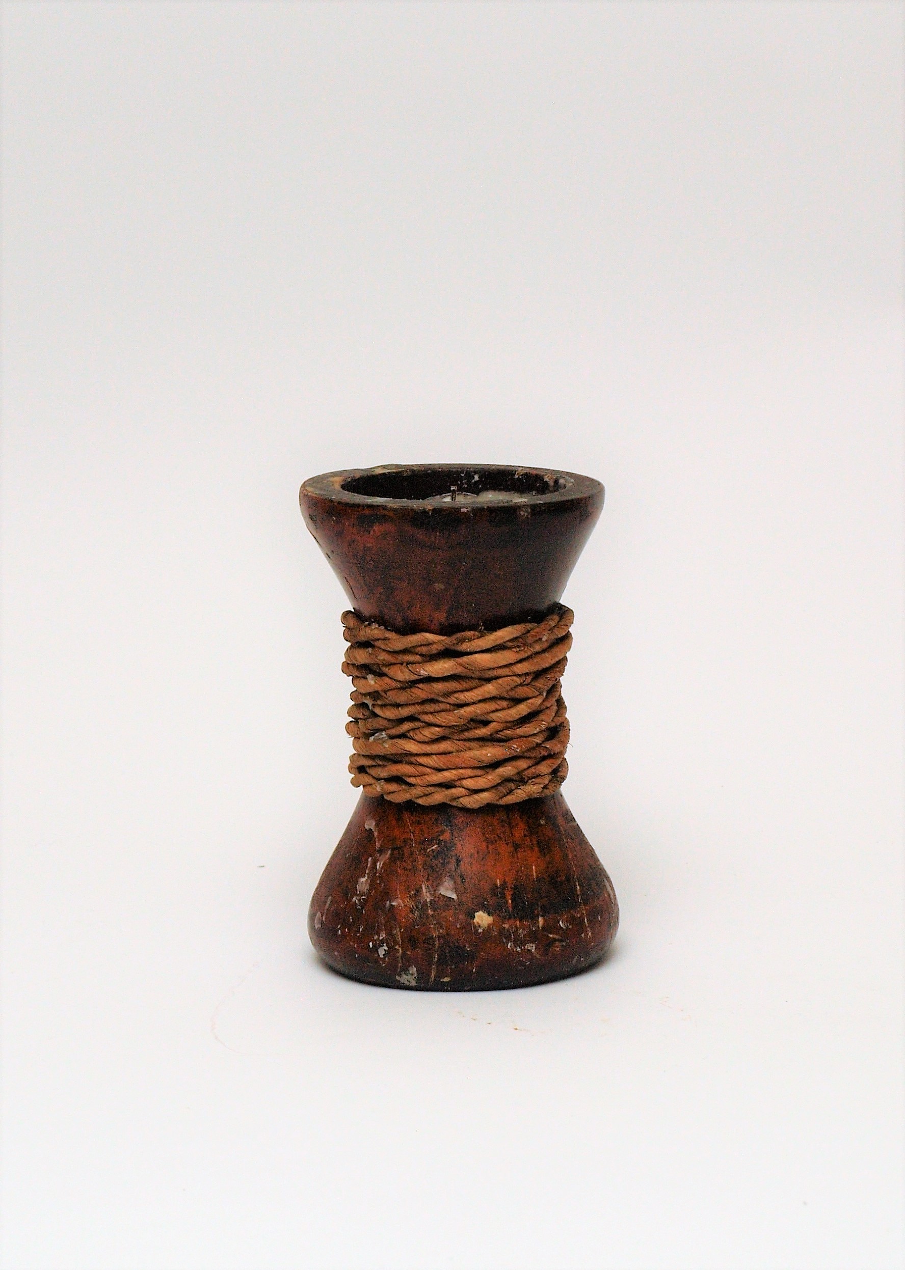 Sarkankoka svečturs ar dekoratīvu auklas sējumu.