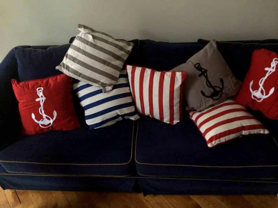Sarkani dekoratīvi spilveni jūras tēmā ar enkuru.