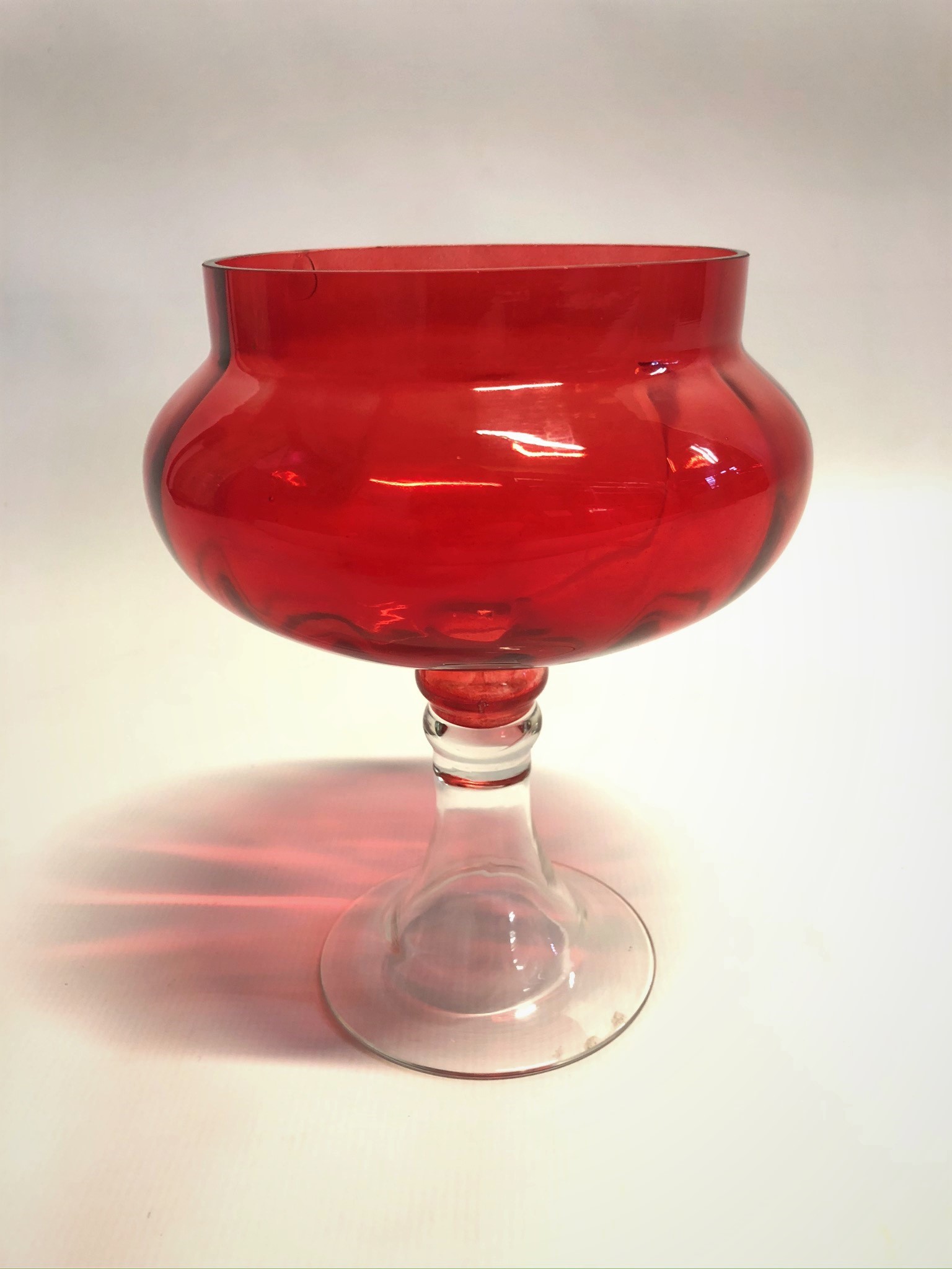 Stikla trauks ar caurspīdīgu kāju un sarkanu augšējo daļu.