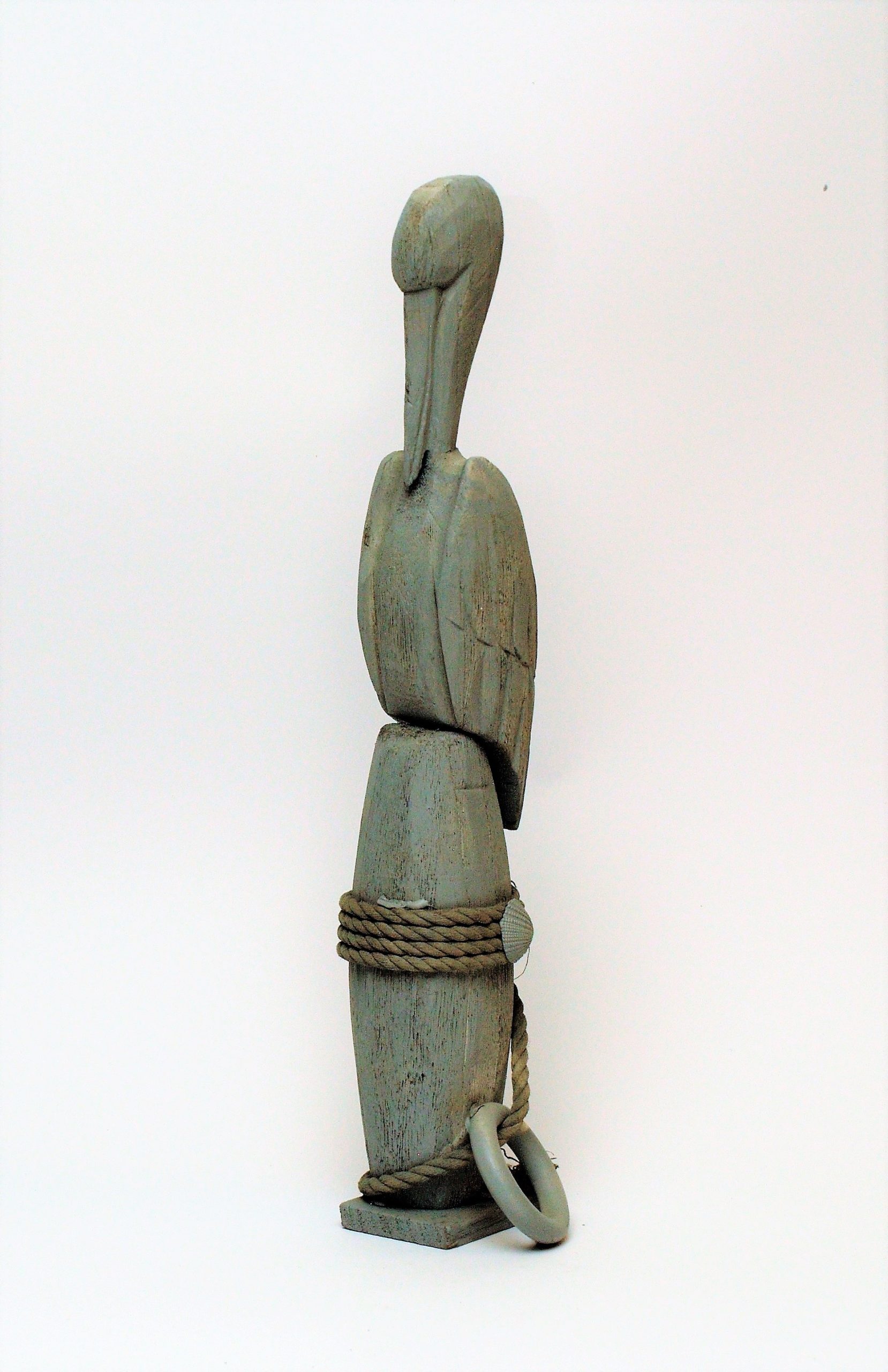Pelēka koka stārķa figūra ar jūras elementiem.