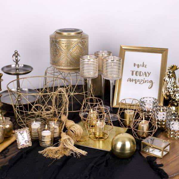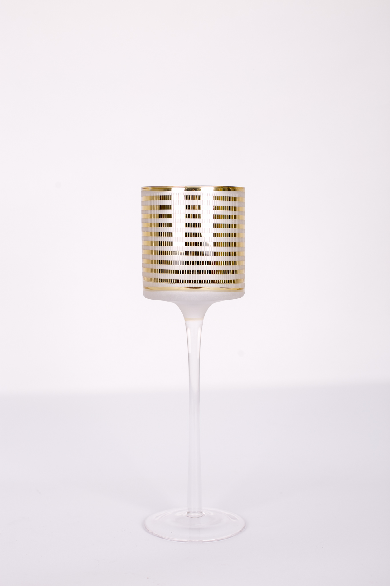 Stikla svečturis uz kājiņas ar zelta krāsas svītrām.