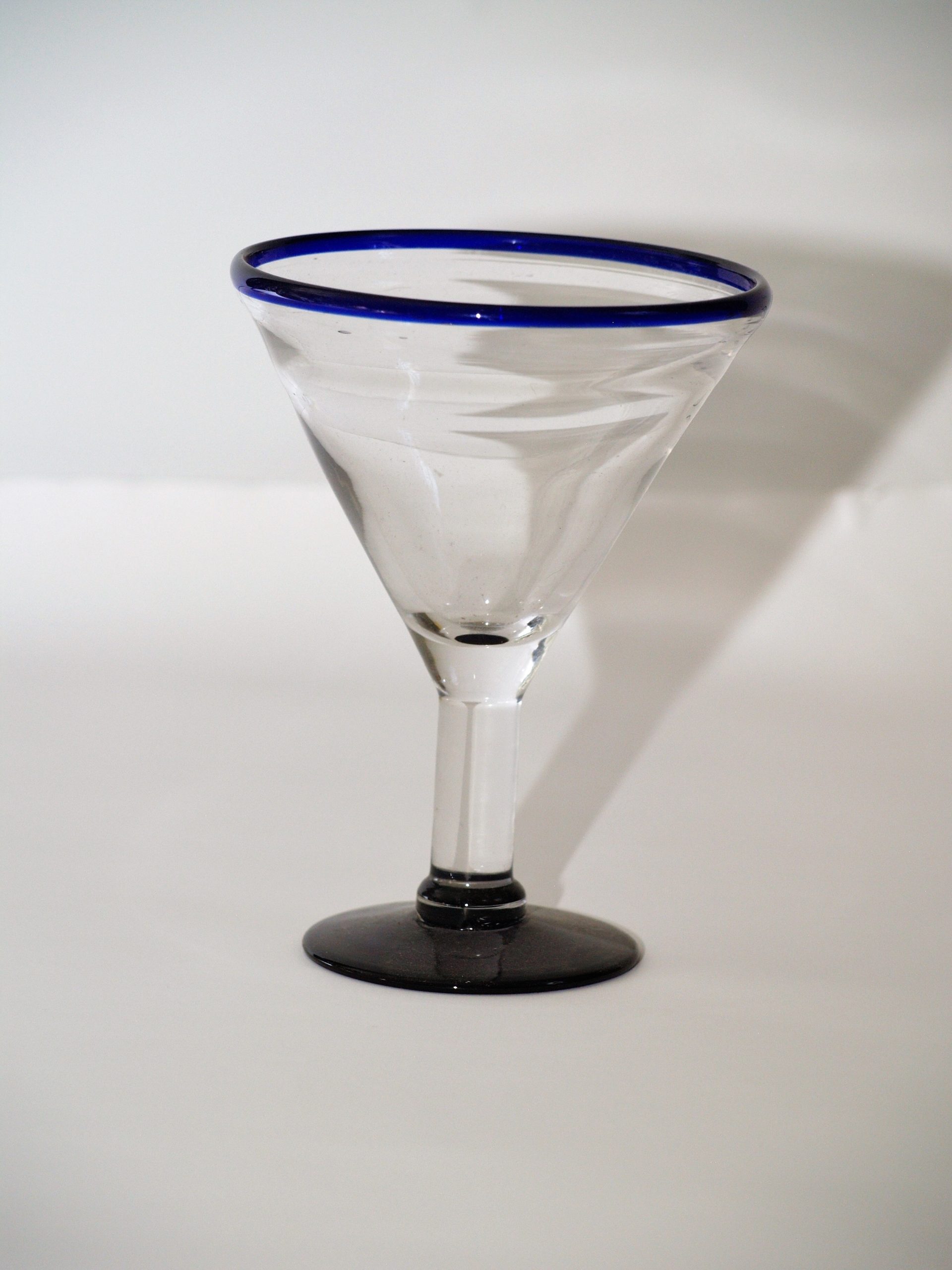 Stikla glāze uz kājas ar tumši zilu dekoru. Martini glāzes tipa forma ar melnu kājiņu.