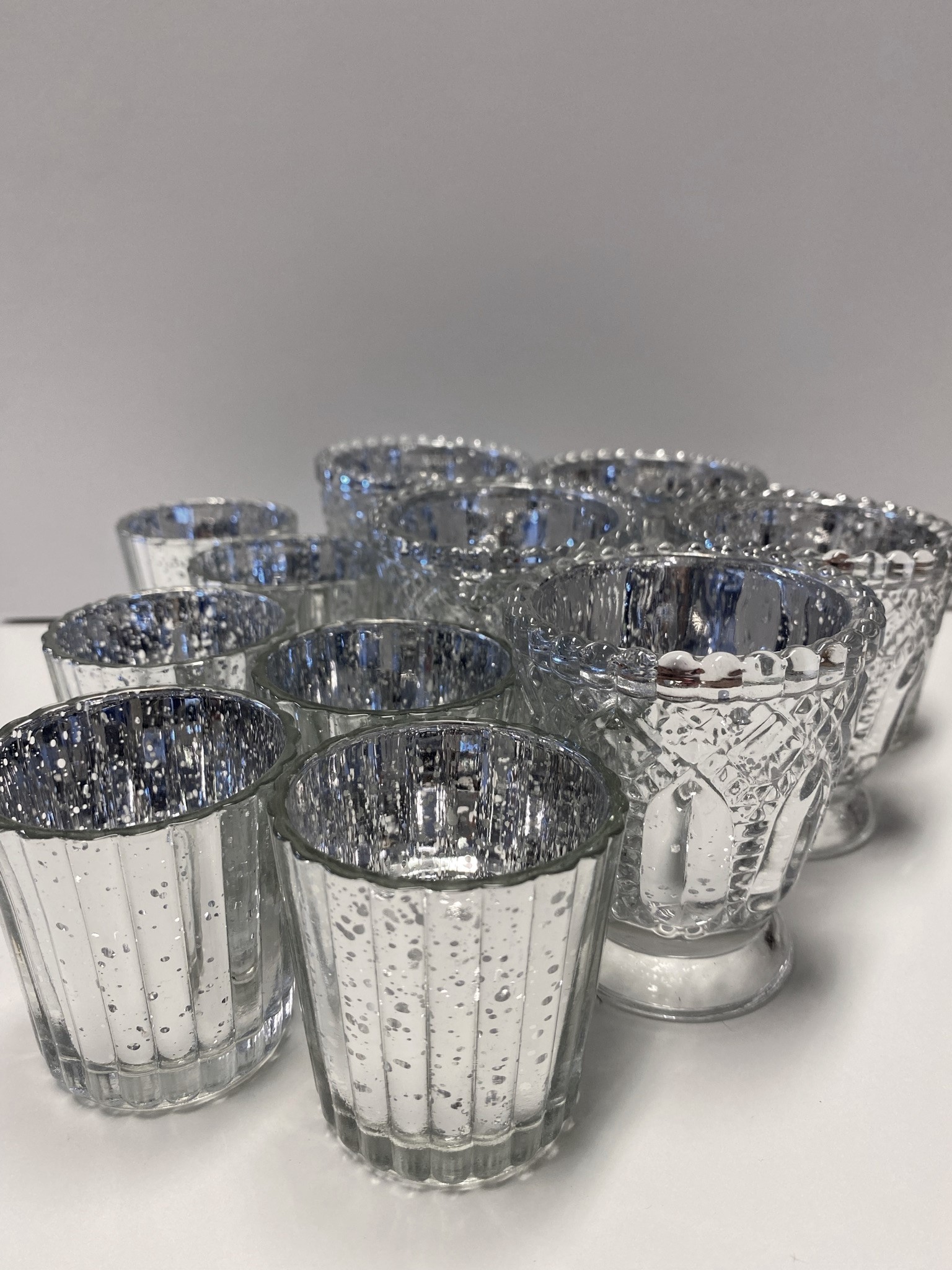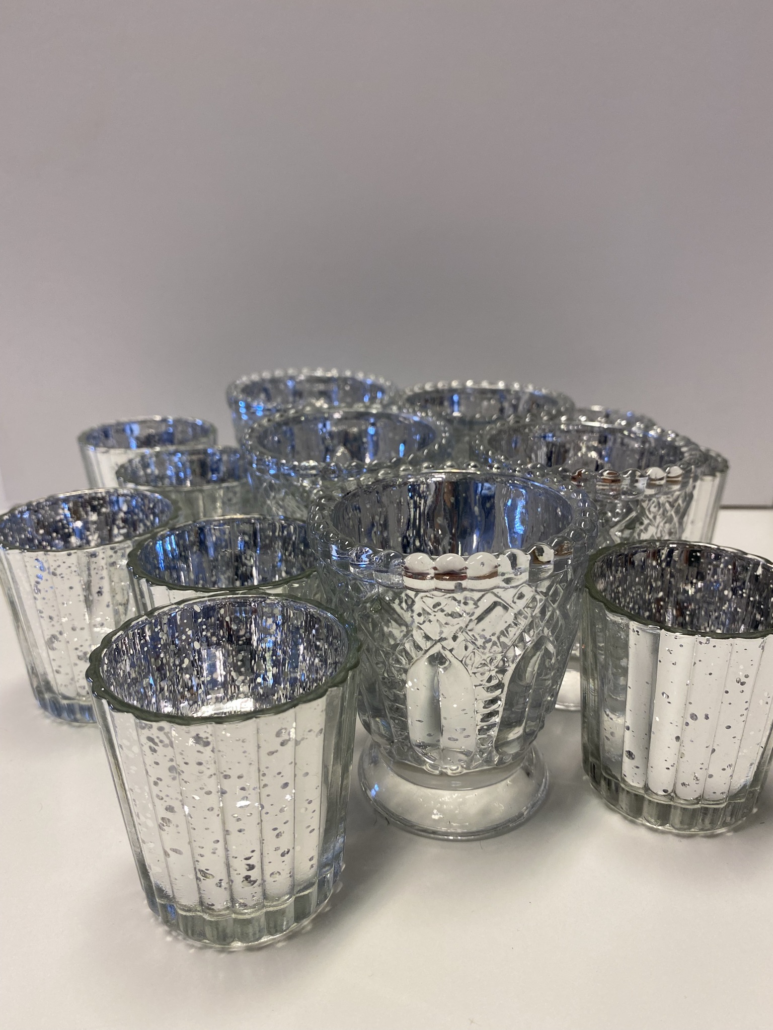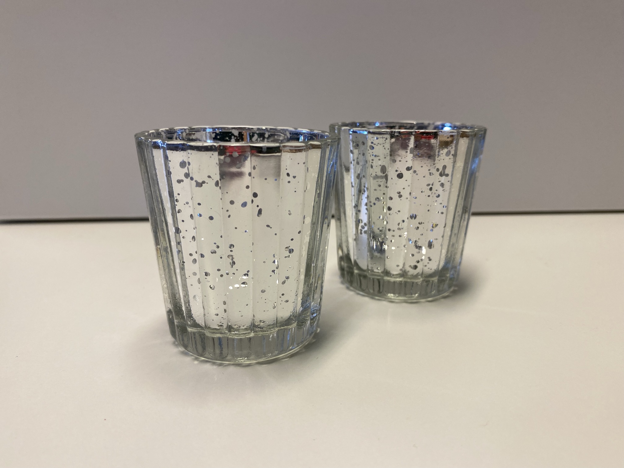 Mazi, mirdzoši sudraba svečturi tējas svecēm no stikla.