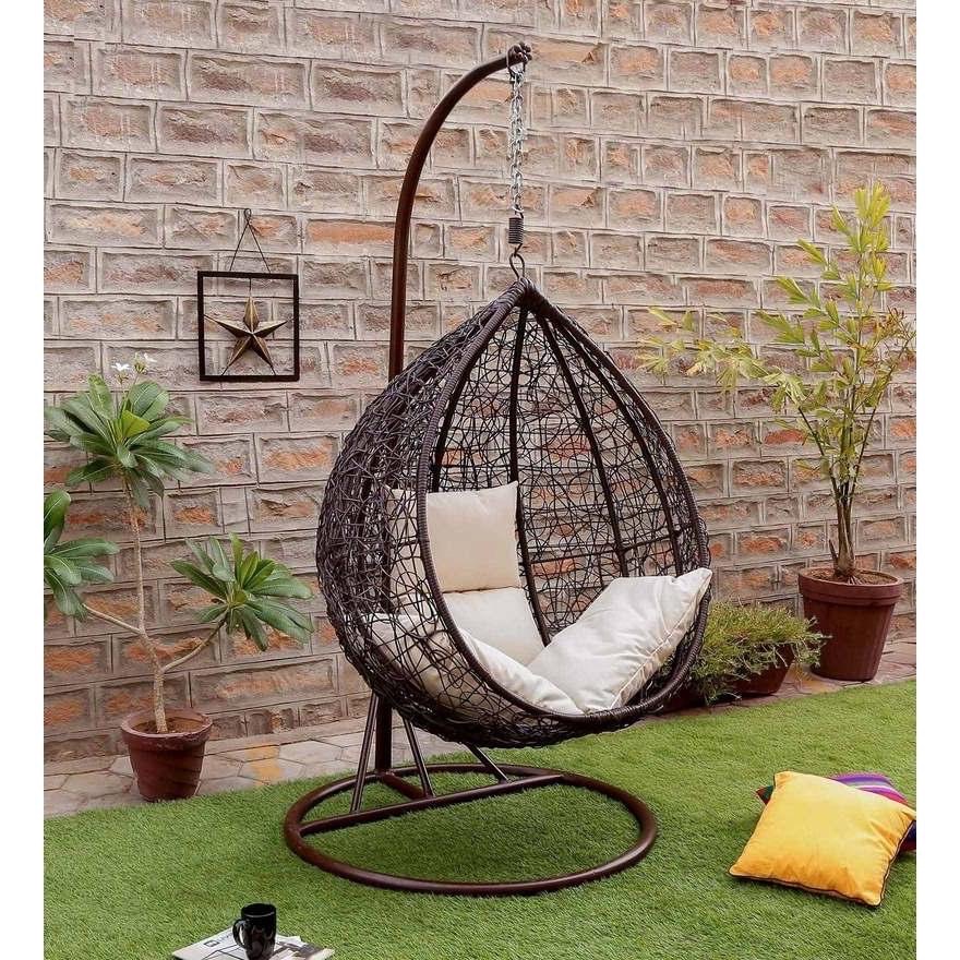 Piekaramie šūpuļkrēsli ar statīvu un mīkstu spilvenu tumši brūnā krāsā.