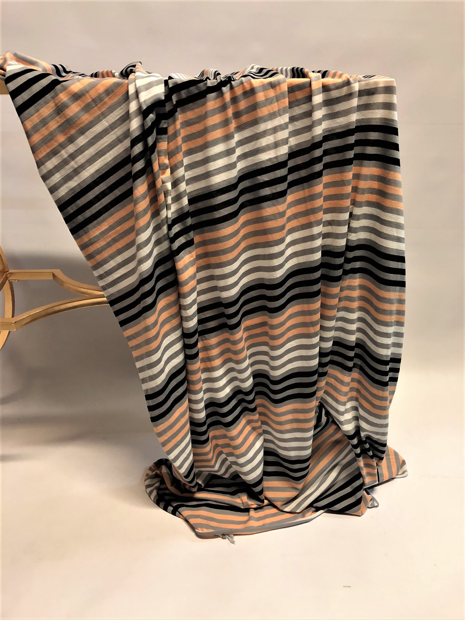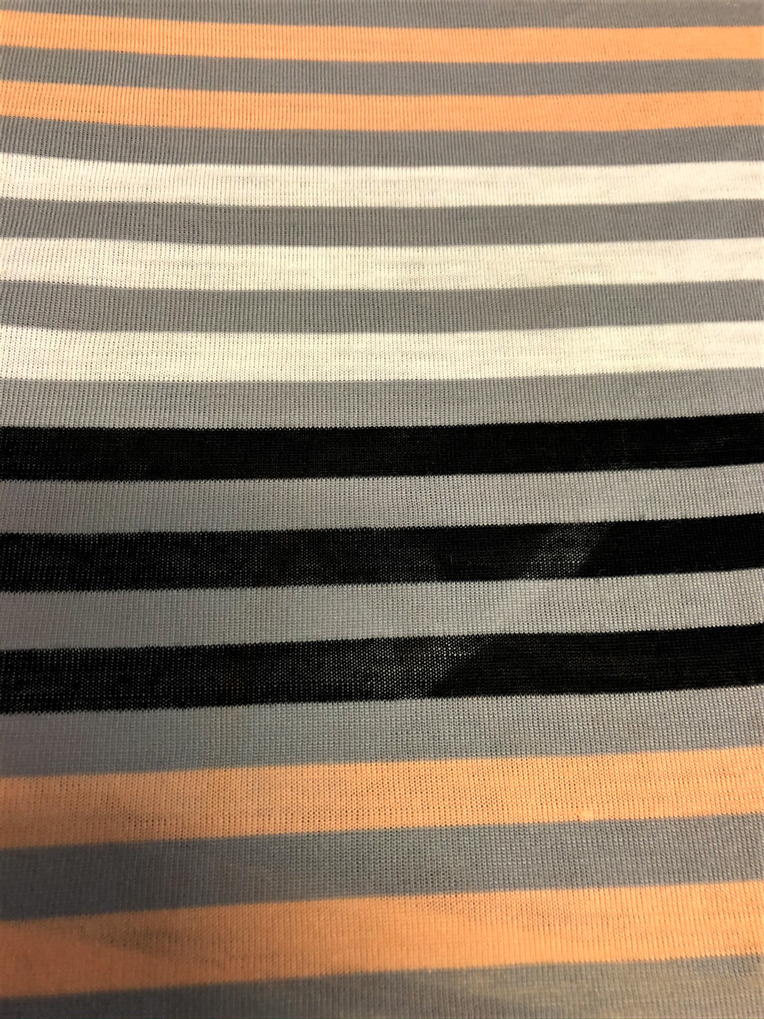 Svītrains audums ar elastānu un neapstrādātām malām. Krāsas – melns, pelēks, balts, gaiši oranžs.