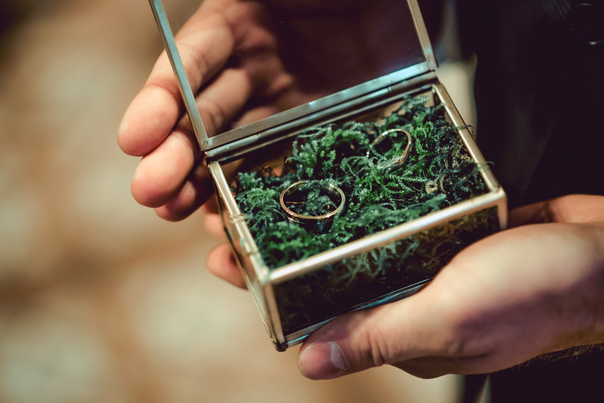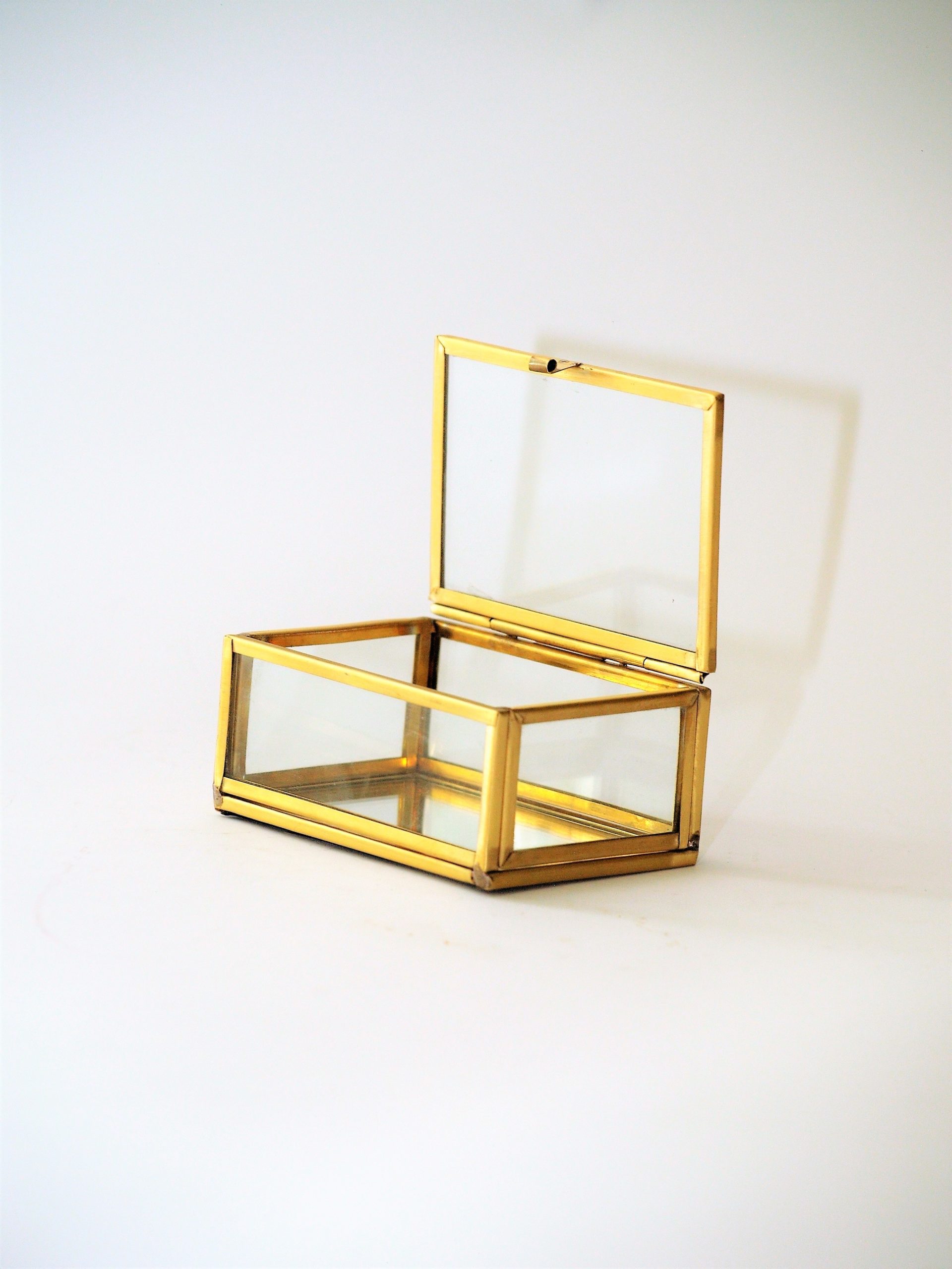 Stikla kastīte ar zelta apdari un spoguļa pamatni.
