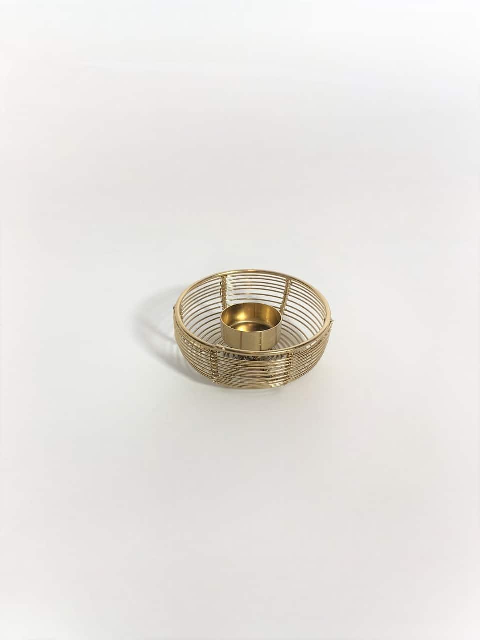 Nelieli zelta svečturi pītā metāla ietvarā tējas svecēm.
