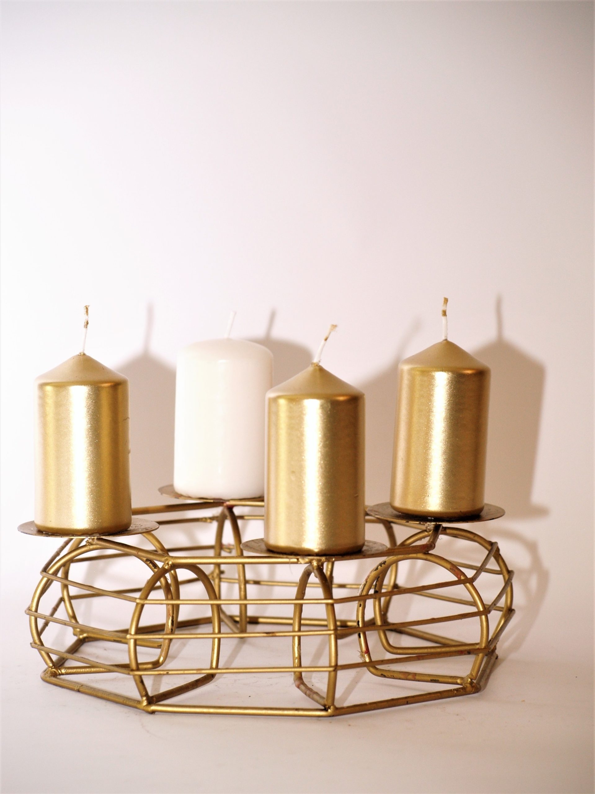 Zelta krāsas svečturis četrām svecēm – vainags ar metāliskām stīpām.